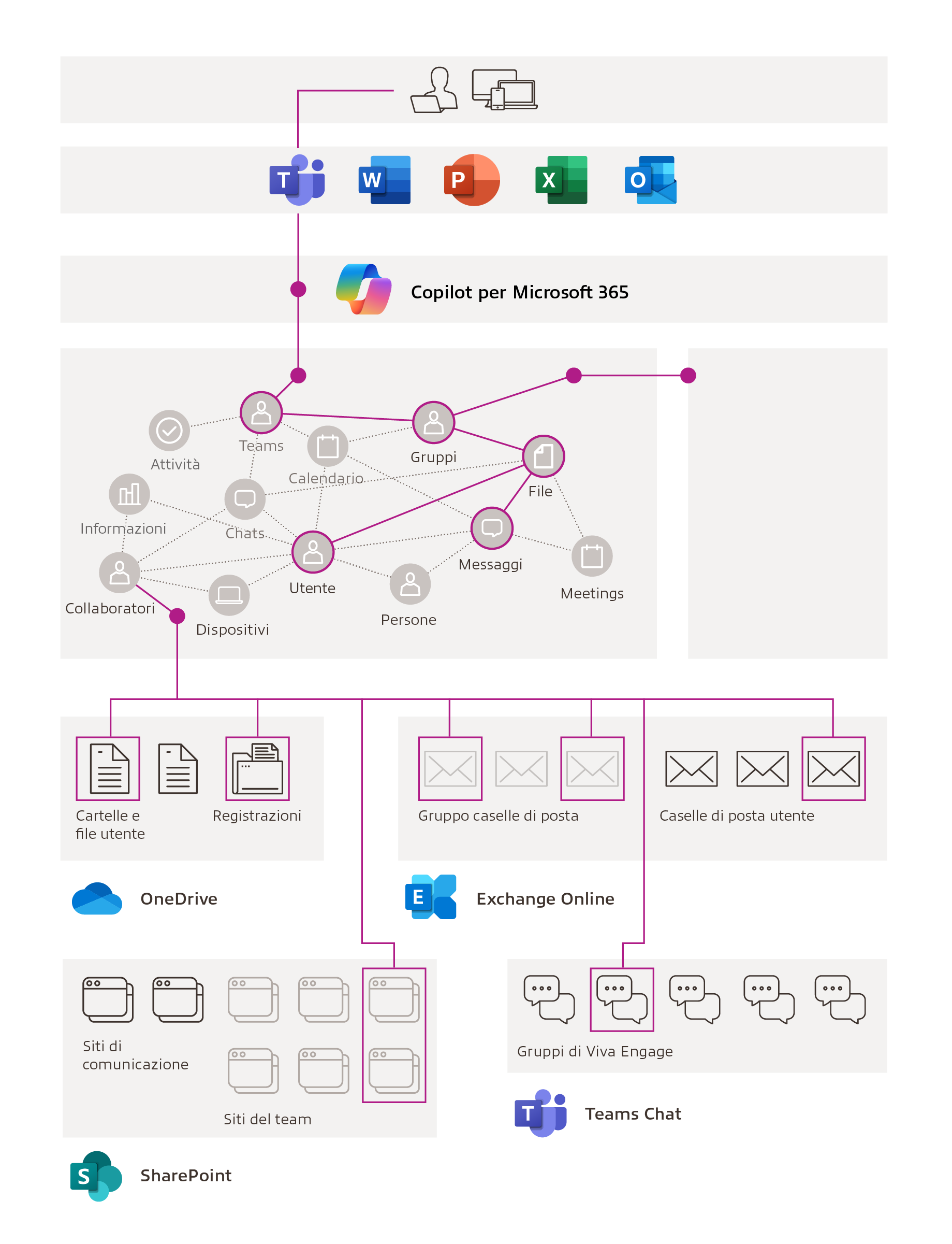 Il Semantic Index per Copilot identifica relazioni e connessioni dei dati utente e aziendali. Insieme a Copilot e Microsoft Graph, crea una mappa sofisticata di tutti i dati e contenuti nella tua organizzazione per consentire a Copilot di fornire risposte personalizzate e pertinenti. Il Semantic Index fa parte del servizio Microsoft 365 e viene creato automaticamente.